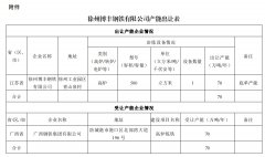 按照《国务院关于化解产能严重过剩矛盾的指导意见》、《国务院关于钢铁行业化解过剩产能实现脱困发展的意见》和《钢铁行业产能置换实施办法》要求,我厅自2024年2月8日至2024年3月13日对徐州博丰钢铁有限公司70万吨炼铁产能出让情况进行了公示。公示期间收到了山东潍焦集团薛城能源有限公司的书面异议,后已撤回异议。现予公告。