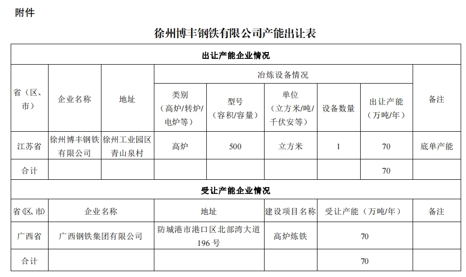 徐州博丰钢铁70万吨炼铁产能出让公告