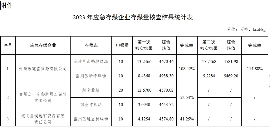 据《省煤电保障供应领导小组办公室关于组织开展2023年应急存煤申报工作的通知》(黔煤电保供〔2023〕11号)、《省煤炭产业结构战略性调整工作领导小组办公室关于明确2023年应急存煤有关事宜的通知》(黔煤战略调整办〔2023〕3号)文件要求,省能源局委托贵州省煤田地质局水源队对全省应急存煤情况进行了现场核查,现就有关情况公示如下: