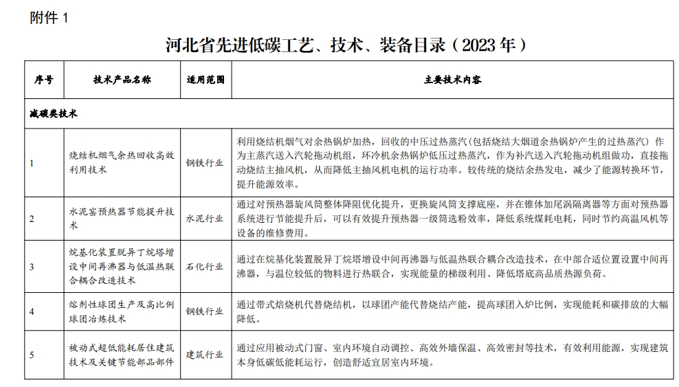 为贯彻落实国家碳达峰碳中和战略部署,加快低碳先进科技成果转化与推广应用,发挥科技创新的支撑引领作用,引导各行业主动采用先进适用的低碳技术,推进绿色低碳转型发展,我厅组织编制了《河北省先进低碳工艺、技术、装备目录(2023年)》,现予以公开。请有关部门、单位及企业到河北省生态环境厅网站查阅、下载。