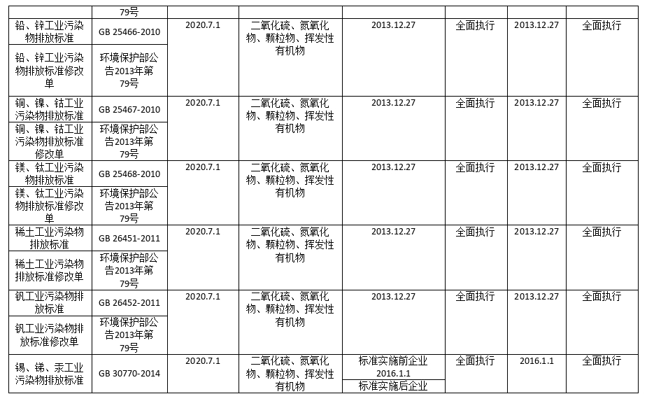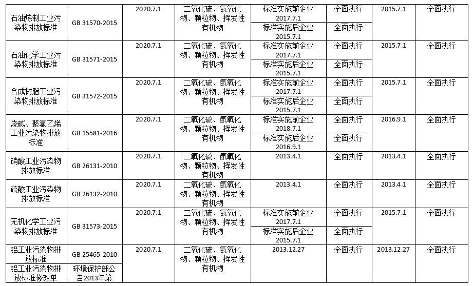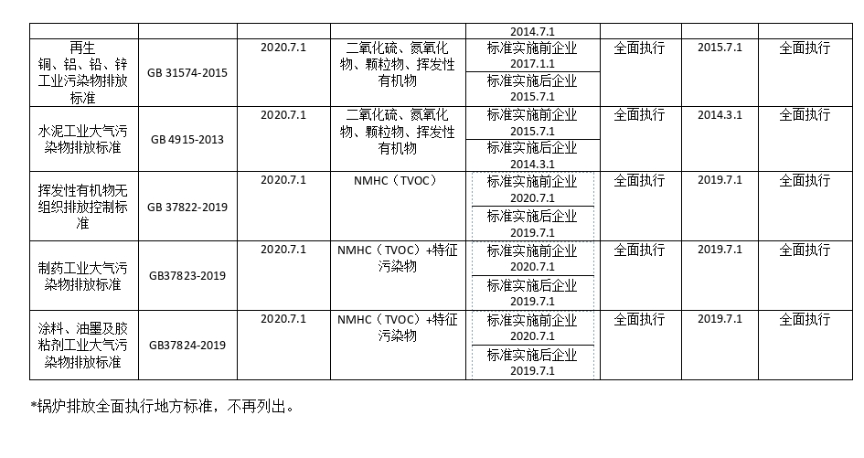 二、《公告》实施前的企业,除火电(不含燃煤电厂)继续按照《公告》要求执行外,对于国家排放标准中已规定大气污染物特别排放限值的钢铁、石化、水泥、有色、化工等行业,自2020年7月1日起执行二氧化硫、氮氧化物、颗粒物、挥发性有机物特别排放限值;对于国家排放标准中未规定大气污染物特别排放限值的行业,待相应排放标准制订后执行二氧化硫、氮氧化物、颗粒物、挥发性有机物特别排放限值和特别控制要求,执行时间与排放标准规定的现有企业实施时间同步。
