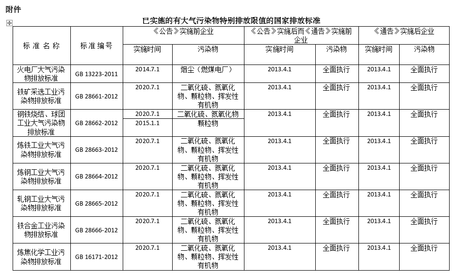 附件:已实施的有大气污染物特别排放限值的国家排放标准