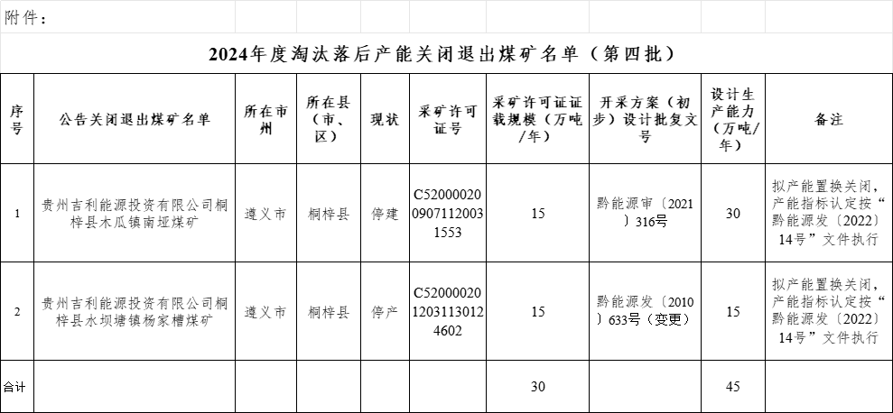 按照《国务院关于煤炭行业化解过剩产能实现脱困发展的意见》(国发〔2016〕7号)、《贵州省人民政府关于煤炭工业淘汰落后产能加快转型升级的意见》(黔府发〔2017〕9号)等要求,经地方人民政府对2024年企业自愿申请关闭的安全生产条件差、资源枯竭、布局不合理和不符合国家产业政策的煤矿(含矿权)进行审查,现将企业自愿申请关闭且经公示无异议的贵州吉利能源投资有限公司桐梓县木瓜镇南垭煤矿、贵州吉利能源投资有限公司桐梓县水坝塘镇杨家槽煤矿有关信息予以公告(详见附件),请各有关单位按要求做好以下工作。