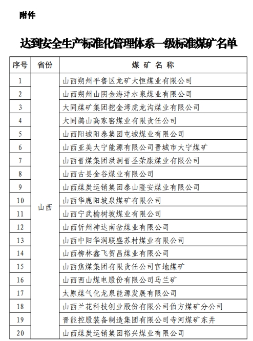 附件:达到安全生产标准化管理体系一级标准煤矿名单