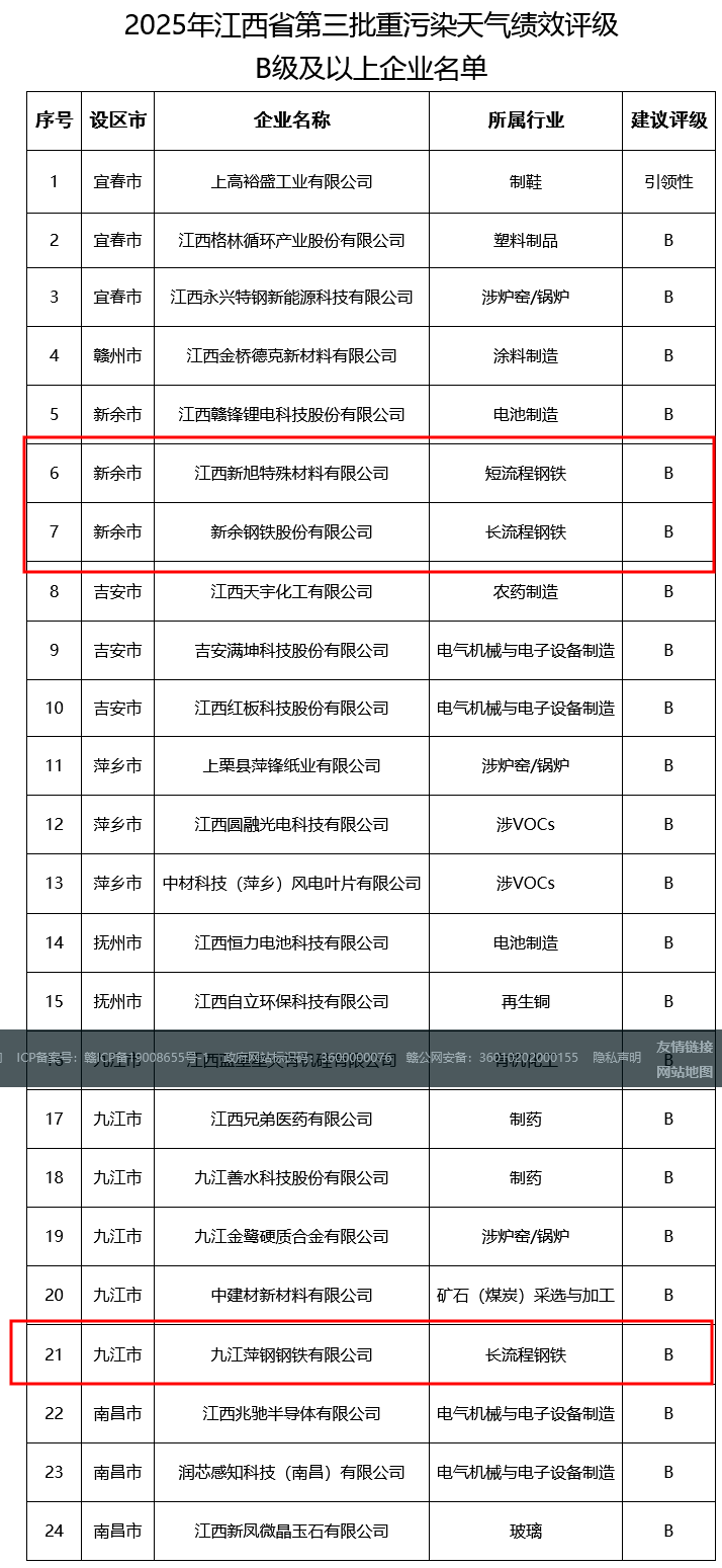 附件:2025年江西省第三批重污染天气绩效评级B级及以上企业名单