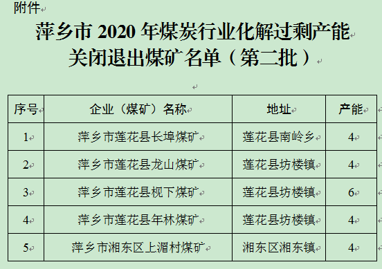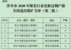 根据《国务院关于煤炭行业化解过剩产能实现脱困发展的意见》(国发〔2016〕7号)、《江西省发展改革委等二十四部门关于印发江西省深入推进2017年煤炭行业化解过剩产能实现脱困发展工作实施方案的通知》(赣发改能源〔2017〕626号),按照国家发展和改革委《关于做好2019年重点领域化解过剩产能工作的通知》(发改运行〔2019〕785号)要求,现将我市2020年第二批煤炭行业化解过剩产能关闭退出煤矿名单予以公示。