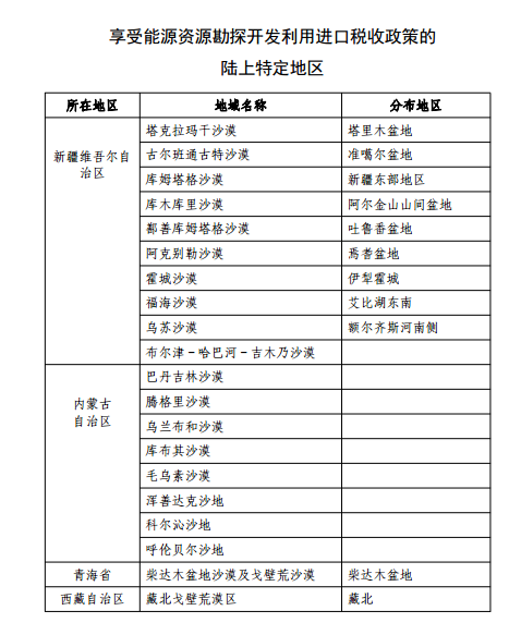 享受能源资源勘探开发利用进口税收政策的陆上特定地区: