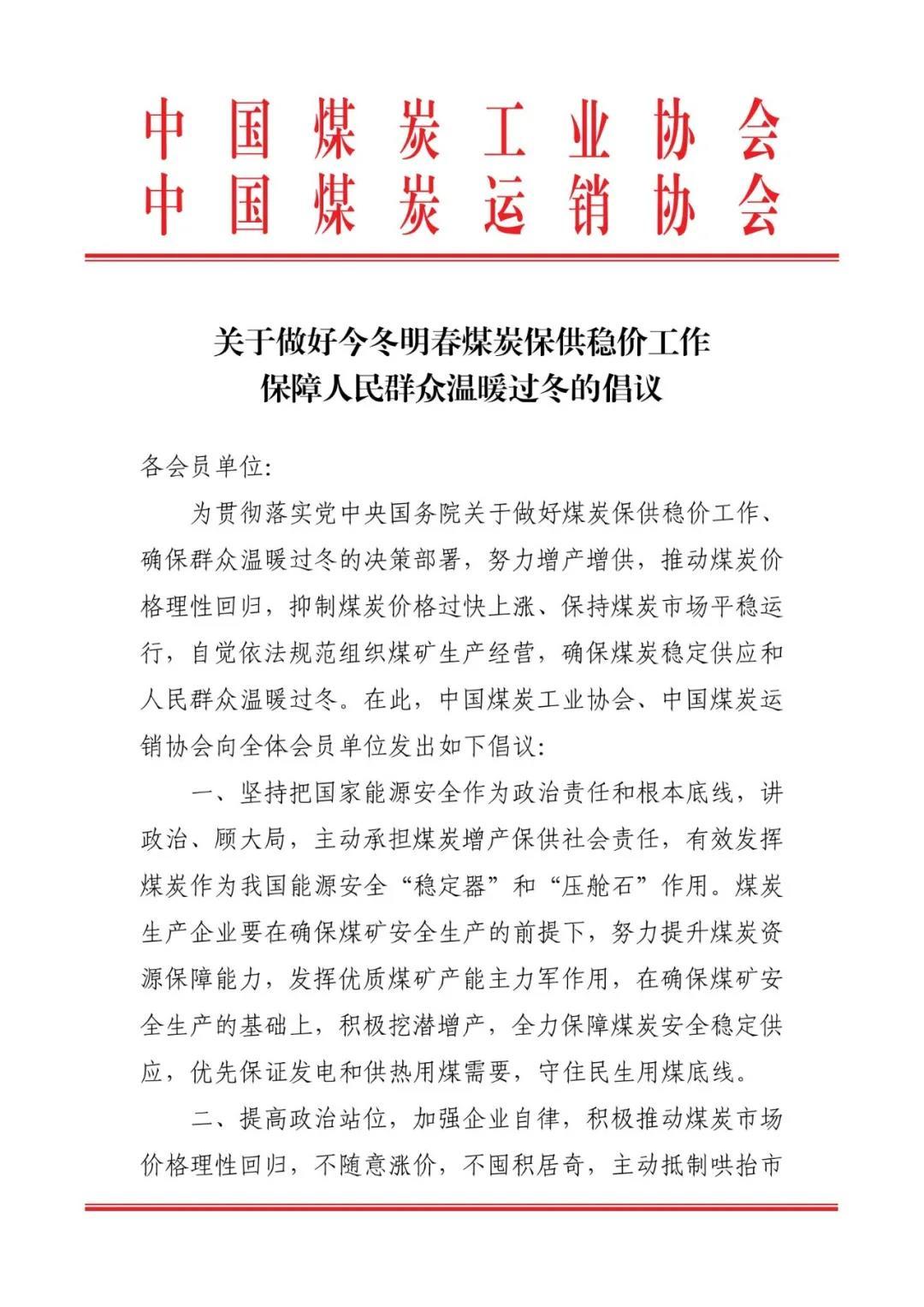 中国煤炭工业协会、中国煤炭运销协会发布做好今冬明春煤炭保供稳价工作倡议:及早启动2022年度煤炭产运需衔接工作。煤炭生产企业要及早谋划,主动与下游用煤企业、铁路运输部门衔接,做好2022年度全国煤炭中长期合同签订工作,增加中长期合同签订数量、提高签订比例,早签、多签、签实、签长煤炭中长期合同,提高全国煤炭稳定供应保障能力促进煤炭市场长周期平稳运行。