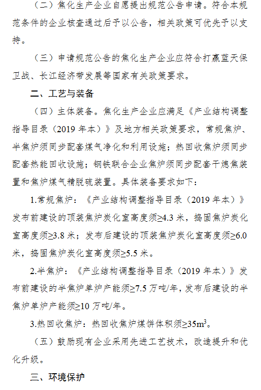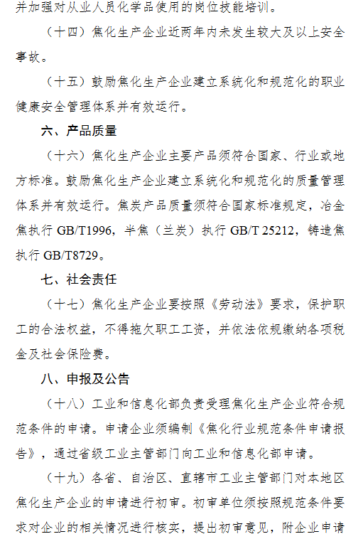 为进一步加快焦化行业转型升级,促进焦化行业技术进步,提升资源综合利用率和节能环保水平,推动焦化行业高质量发展,根据国家有关法律法规和产业政策,制定《焦化行业规范条件》,现予以公告。