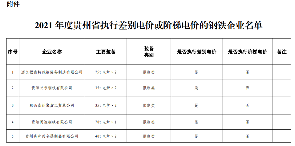 根据国家发展改革委、工业和信息化部《关于运用价格手段促进钢铁行业供给侧结构性改革有关事项的通知》(发改价格〔2016〕2803号)要求,结合省内钢铁企业装备工艺和上年度钢铁企业能耗专项监察情况,经征询省发展改革委意见,我厅研究确定了2021年度贵州省执行差别电价或阶梯电价的钢铁企业名单,现予公布。