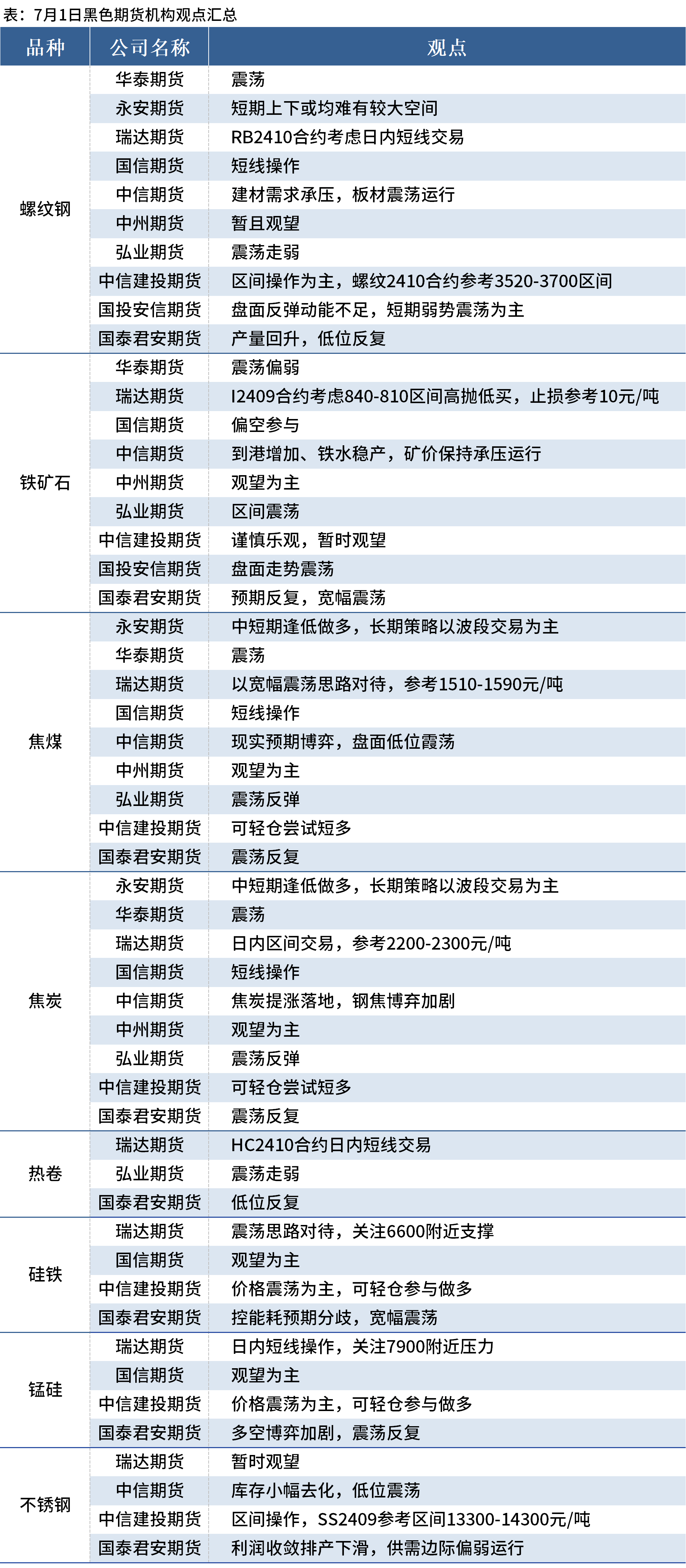 据Mysteel统计7月1日10家期货机构操作策略,其中多数机构料螺纹钢震荡运行,铁矿石震荡运行,焦煤、焦炭震荡运行。具体汇总内容如下:
