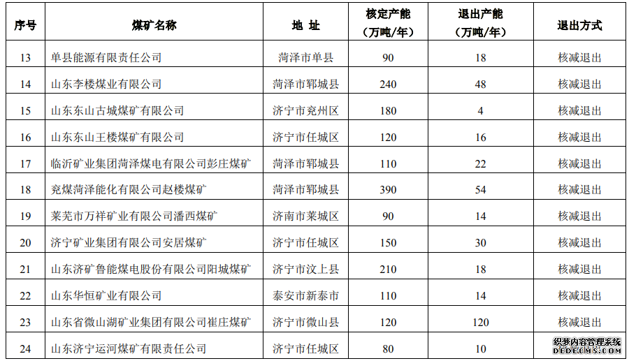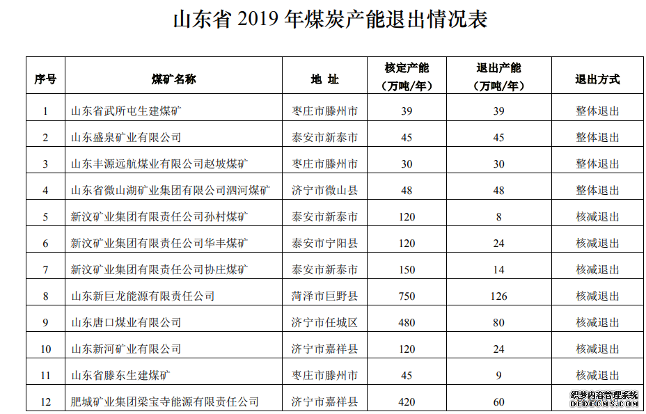 为贯彻落实《国务院关于煤炭行业化解过剩产能实现脱困发展的意见》(国发〔2016〕7号)部署,按照国家发展改革委等部门《关于做好2019年重点领域化解过剩产能工作的通知》(发改运行〔2019〕785号)要求,山东省深化推进煤炭行业化解过剩产能工作,印发《关于公布2019年化解煤炭过剩产能工作目标的通知》,计划关退煤矿4处、化解过剩产能162万吨。由省能源局牵头组织省财政厅、省人力资源社会保障厅、省自然资源厅、省国资委、山东煤监局等部门组成省级联合验收组对4处煤矿进行省级联合验收,全部达到了煤炭去产能关退标准要求。2019年全省实际关退煤矿4处、化解过剩产能875万吨,其中关退煤矿4处,化解过剩产能162万吨;核减生产煤矿产能20处,压减产能713万吨,完成了去产能任务。现予以公告。