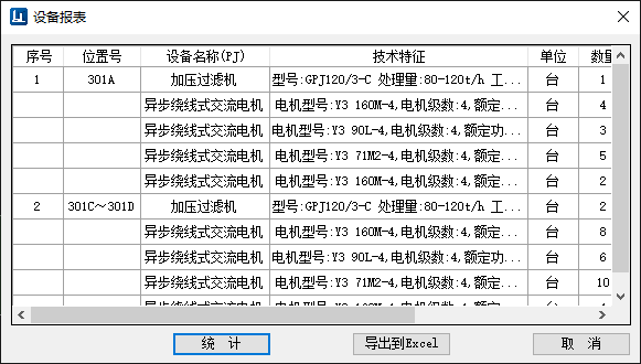 “统计”组别可针对围栅内部、不同类别的数字化元件模型进行分类统计,并能一键导出满足设计需求的设备清册,统计报表会依据位置号自动进行排序,可避免后期复杂的手工操作,节省人工制表时间,提高设计效率。