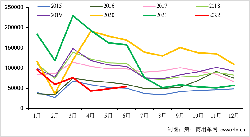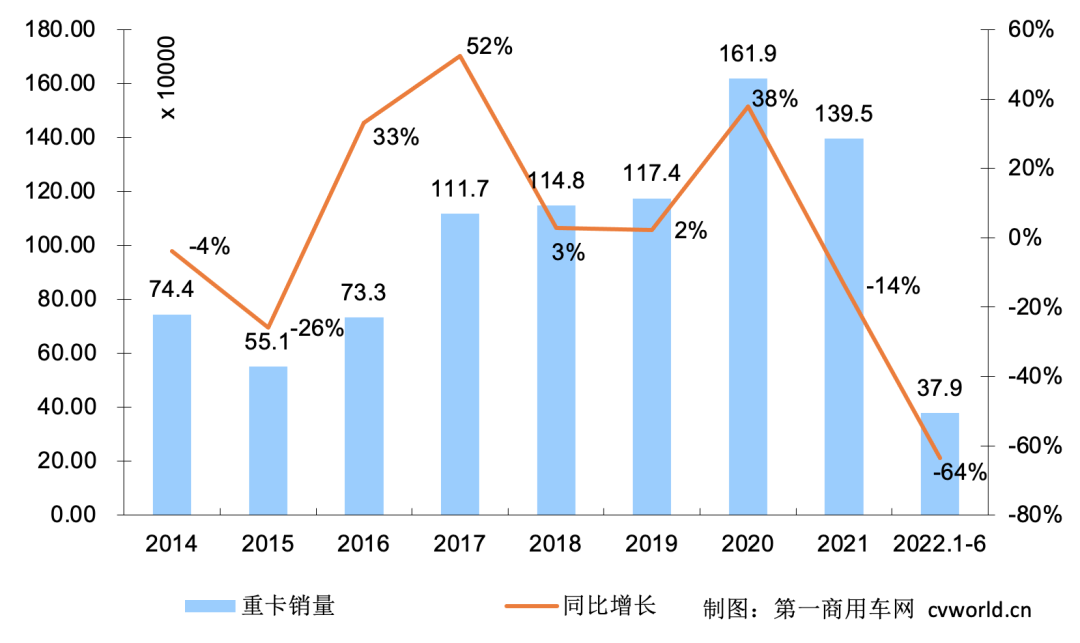 6月份过后,2022年上半年的重卡市场累计销售37.9万辆,比上年同期的104.5万辆下降64%,减少了66.6万辆。整个二季度,重卡市场累计销售14.71万辆,同比下降71%,净减少36.6万辆。