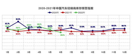 6月30日,中国汽车流通协会发布的最新一期“中国汽车经销商库存预警指数调查”VIA(VehicleInventoryAlertIndex)显示,2022年6月中国汽车经销商库存预警指数为49.5%,同比下降6.6个百分点,环比下降7.3个百分点,库存预警指数位于荣枯线之下。得益于国家及地方政府陆续出台包括财政补贴、减征购置税、放宽汽车限购等在内的系列促进汽车消费的相关政策,汽车流通行业进入景气区间。