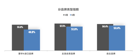 从分品牌类型指数看:6月进口&豪华品牌、主流合资品牌、自主品牌指数环比下降。购置税减半政策惠及大部分合资及少部分豪华品牌汽车,销量整体向好,库存预警指数下降。