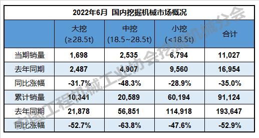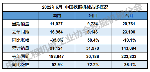 2022年1-6月纳入统计的26家主机制造企业,共计销售各类挖掘机械产品143094台,同比下降36.1%。其中,国内市场销量91124台,同比下降52.9%;出口销量51970台,同比增长72.2%。