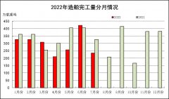 1~7月,50家重点监测的造船企业完工出口船1792万载重吨,同比下降20.8%;承接出口船订单2316万载重吨,同比下降41.9%;7月末手持出口船订单9189万载重吨,同比增长17.1%。出口船舶分别占重点造船企业完工量、新接订单量、手持订单量的89.8%、96.0%和91.5%。