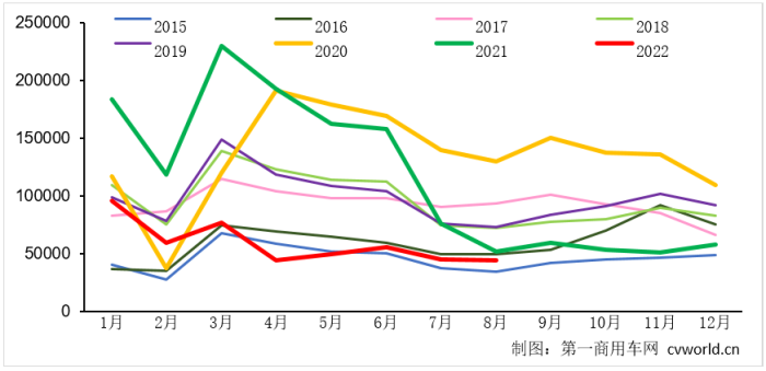 另外需要注意的是,虽然同比降幅已经缩窄至12%,是年内八个月来的最低值,比7月份的40.75%降幅还要少27个百分点。但这主要是去年同期销量基数低的缘故,而非终端市场需求复苏所致。由于去年7月1日起全国范围内开始实施柴油车国六,因此,去年的销量主要集中在上半年,一过7月1日,销量便断崖式下滑——7月份销量从6月份的15.8万辆跌至7.6万辆,环比减少一半,同比下降45%;8月份当月销量更是跌至年底第二低点,仅有5.13万辆,环比7月下降33%。即便去年8月销量如此之差,2022年8月的销量仍然出现了同比下滑,可见市场形势一点也不乐观。