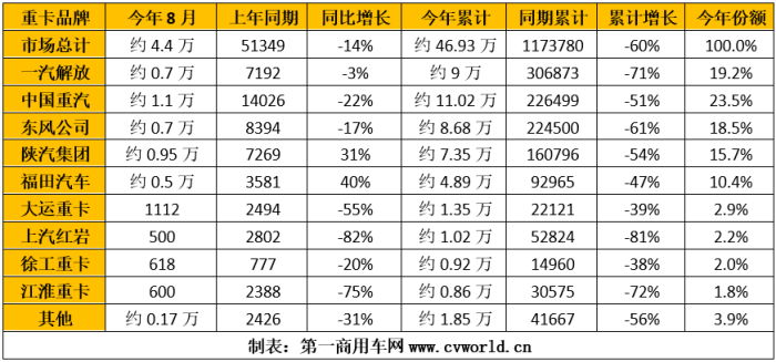 8月份过后,今年1-8月的重卡市场累计销售46.93万辆,比上年同期的117.4万辆下降60%,减少了70.4万辆。