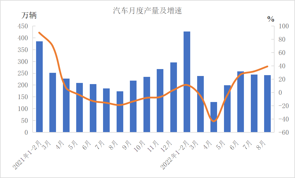 分产品看,1-8月份,金属切削机床38万台,下降10.5%;工业机器人277536套,下降10.5%;汽车1735.8万辆,增长6.1%,其中新能源汽车407.4万辆,增长110.1%;发电机组(发电设备)9602万千瓦,增长2.8%。