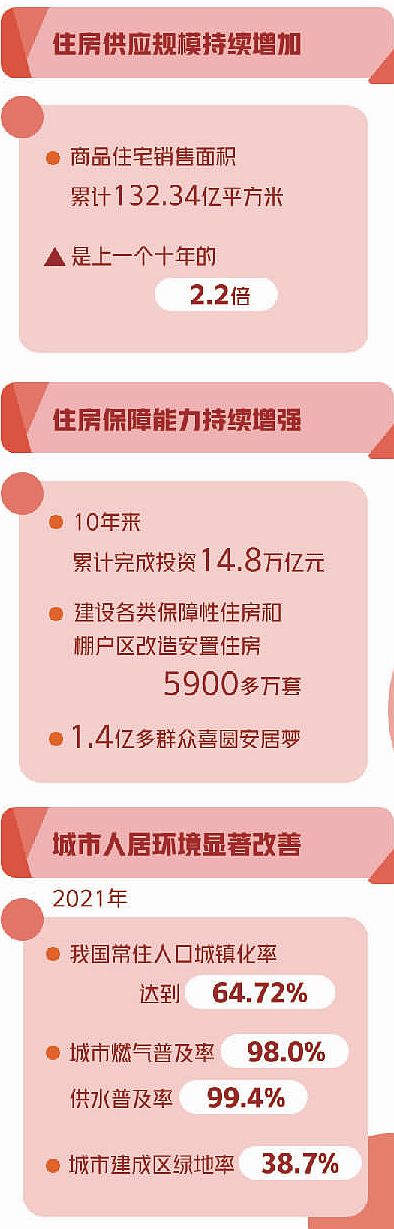 住房问题关系民生福祉。10年来,我国住房市场体系与住房保障体系持续完善。