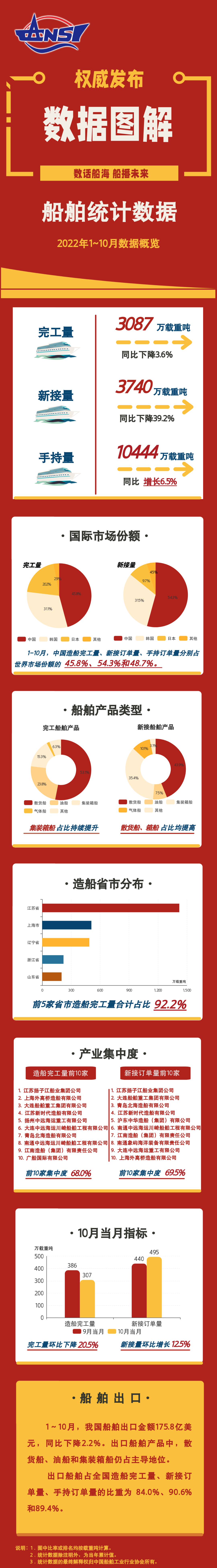 2022年1-10月,全国造船完工3087万载重吨,同比下降3.6%。承接新船订单3740万载重吨,同比下降39.2%。