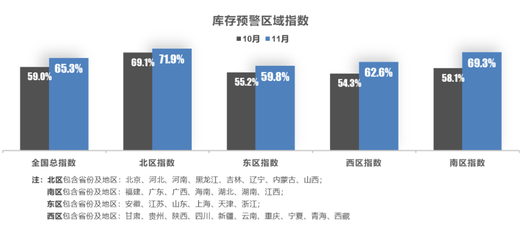 从区域指数情况看: 调查显示,11月全国总指数为65.3%,北区指数为71.9%,东区指数为59.8%,西区指数为62.6%,南区指数为69.3%。广东、北京、河南等汽车销量大省,受疫情影响抑制汽车销量,导致库存预警区域指数较高。