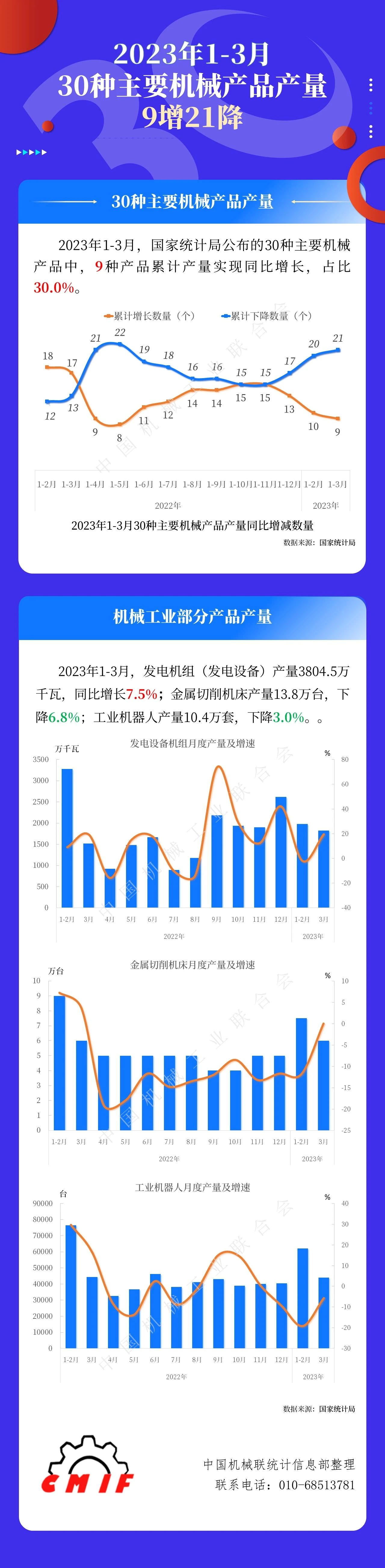 2023年1-3月,国家统计局公布的30种主要机械产品中,9种产品累计产量实现同比增长,占比30%。