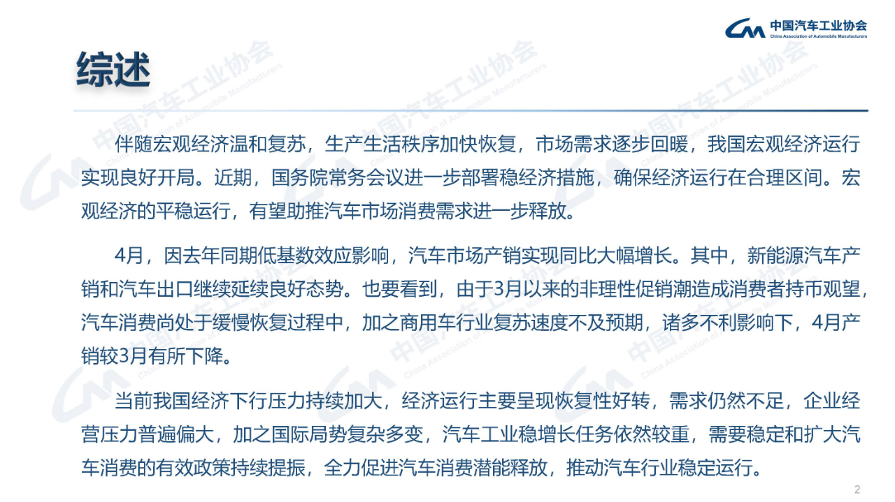 当前我国经济下行压力持续加大,经济运行主要呈现恢复性好转,需求仍然不足,企业经营压力普遍偏大,加之国际局势复杂多变,汽车工业稳增长任务依然较重,需要稳定和扩大汽车消费的有效政策持续提振,全力促进汽车消费潜能释放,推动汽车行业稳定运行。