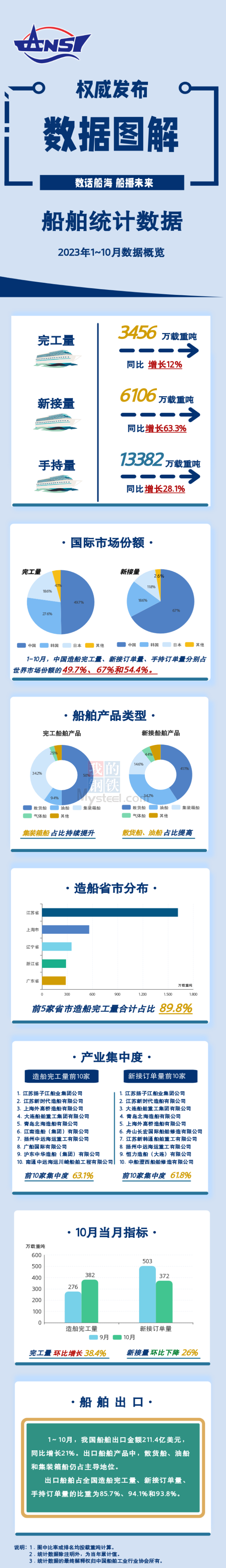 2023年1-10月,全国造船完工量3456万载重吨,同比增长12%;新接订单量6106万载重吨,同比增长63.3%。截至10月底,手持订单量13382万载重吨,同比增长28.1%。