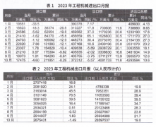 据海关数据整理,2023年11月我国工程机械进出口贸易额为40.58亿美元,同比增长0.89%。其中11月进口金额2.03亿美元,同比下降3.55%;11月出口金额38.55亿美元,同比增长1.14%。1-11月进出口贸易额为469.28亿美元,同比增长9.53%。其中累计进口23.07亿美元,同比下降8.44%;累计出口446.22亿美元,同比增长10.6%。