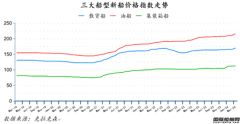 3月份散货船、油船集装箱船新船价格指数分别环比上升4点、5点、1点至170点、216点、113点。
