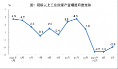 原煤生产降幅收窄,进口明显回升。4月份,规上工业原煤产量3.7亿吨,同比下降2.9%,降幅比3月份收窄1.3个百分点;日均产量1239万吨。进口煤炭4525万吨,同比增长11.3%。