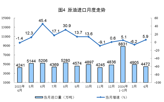 1—4月份,规上工业原油产量7095万吨,同比增长2.1%。进口原油18207万吨,同比增长2.0%。