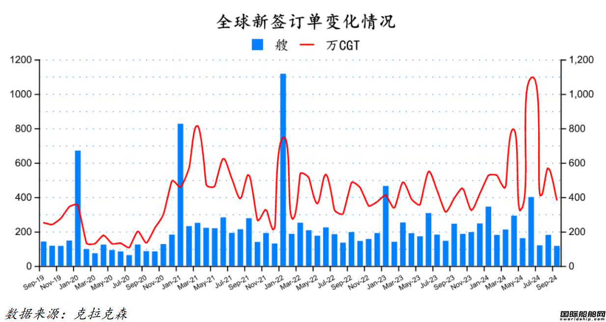 根据克拉克森最新数据统计(截至2024年10月9日),2024年9月份全球新签订单116艘,共计3,865,556CGT。与2024年8月份全球新签订单180艘,共计5,736,893CGT相比较,数量环比减少64艘,修正总吨环比下降32.62%。与2023年9月份全球新签订单245艘,共计3960462CGT相比较,数量同比减少129艘,修正总吨同比下降2.40%。