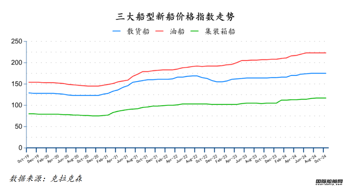 10月份散货船、油船、集装箱船新船价格指数环比均持平,分别为175点、223点、117点。