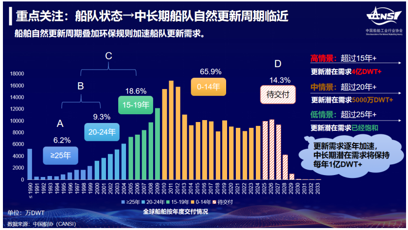 21世纪初的上一轮造船超级周期不仅创造了新接订单量的历史极值,还带来了大规模船舶的交付。叠加减排规则,这些船舶的技术和经济寿命正在接近或已经达到临界点。截至2024年末,超过25年的船舶占全球船队(含在建)的份额6.2%,20—24年的船舶占9.3%,15—19年的船舶占18.6%,三者份额合计超过三成,约合运力5亿DWT的潜在更新需求。随着航运市场回归常态,运费价格回调后,考虑不同情景下的更新条件,老旧船舶的拆解将逐步放量,更新需求将逐年加速,中长期将创造年均1亿DWT的新船需求。