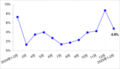 1—2月,完成港口货物吞吐量26.7亿吨,同比增长2.3%。其中,内、外贸吞吐量同比分别增长2.4%和1.9%。完成集装箱吞吐量5354万标箱,同比增长8.2%。