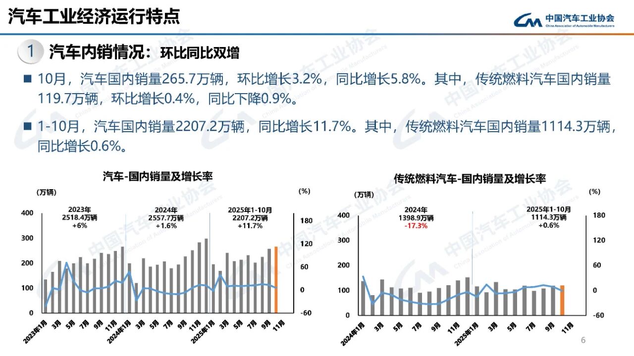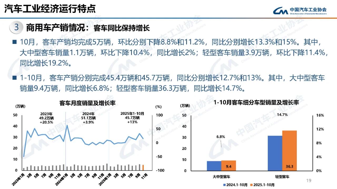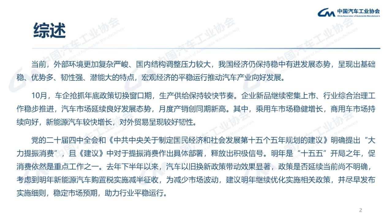 据中国汽车工业协会分析,10月,车企抢抓年底政策切换窗口期,生产供给保持较快节奏。企业新品继续密集上市、行业综合治理工作稳步推进,汽车市场延续良好发展态势,月度产销创同期新高。其中,乘用车市场稳健增长,商用车市场持续向好,新能源汽车较快增长,对外贸易呈现较好韧性。