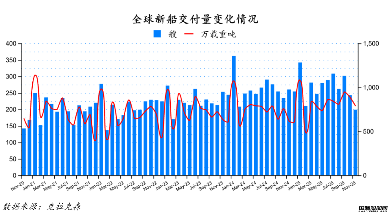 2025年11月份全球船厂共交付新船199艘,共计7,948,649载重吨。与2025年10月份全球新船交付订单243艘,共计8,950,041载重吨相比较,数量环比下降18.11%,载重吨环比下降11.19%。与2024年11月份全球船厂共交付新船260艘,共计6,188,064载重吨相比较,数量同比下跌23.46%,载重吨同比上升28.45%。