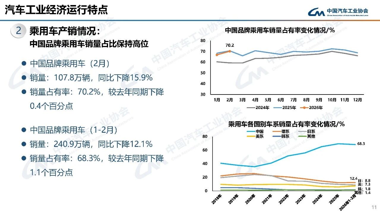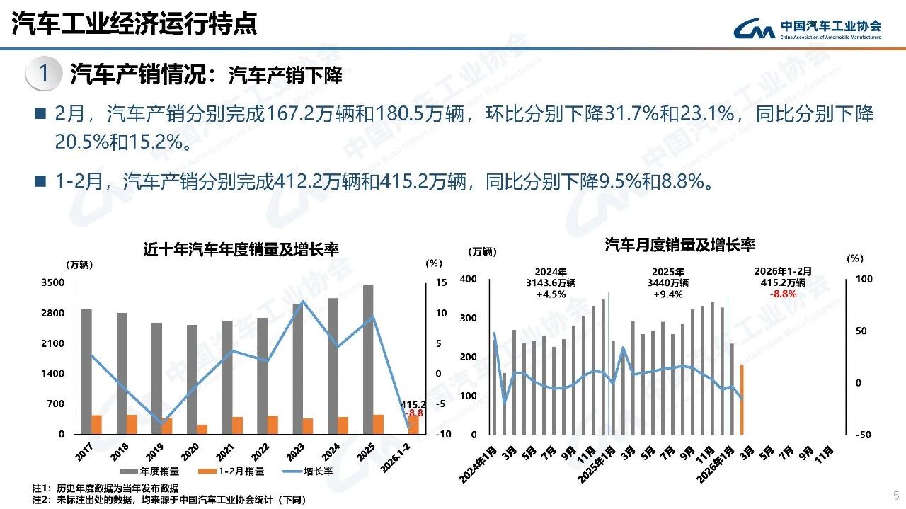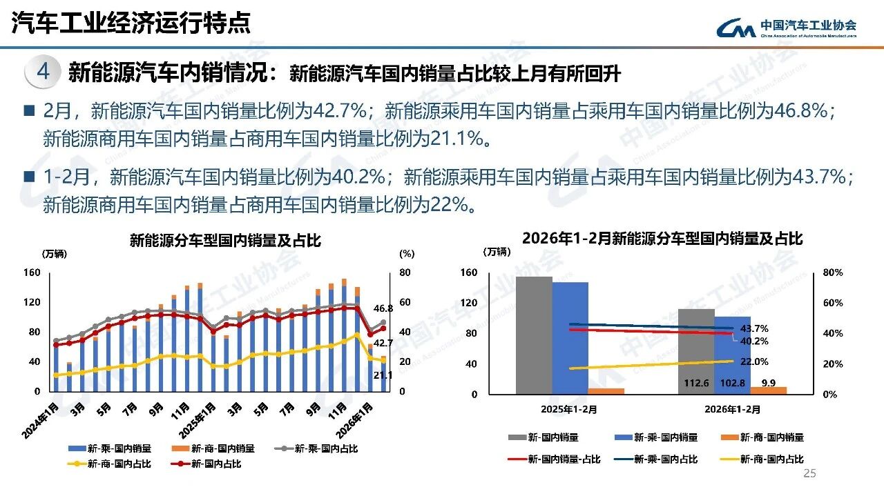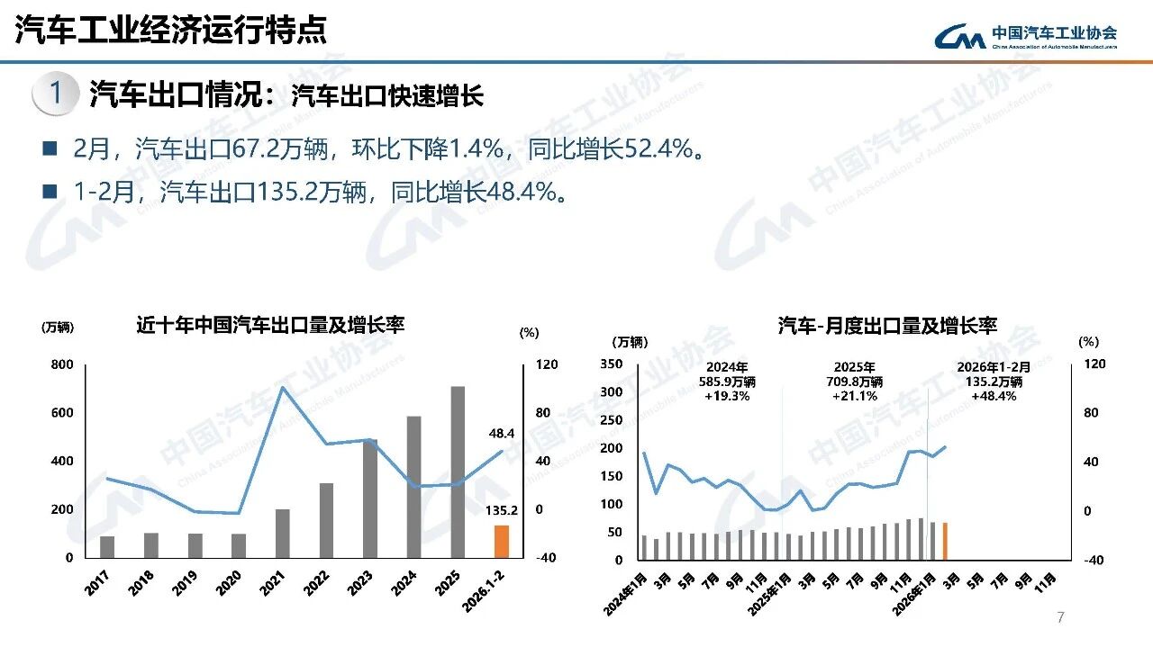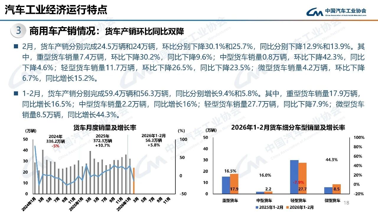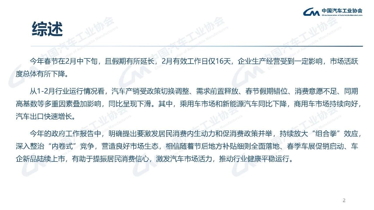 据中国汽车工业协会分析,今年春节在2月中下旬,且假期有所延长,2月有效工作日仅16天,企业生产经营受到一定影响,市场活跃度总体有所下降。从1-2月行业运行情况看,汽车产销受政策切换调整、需求前置释放、春节假期错位、消费意愿不足、同期高基数等多重因素叠加影响,同比呈现下滑。其中,乘用车市场和新能源汽车同比下降,商用车市场持续向好,汽车出口快速增长。