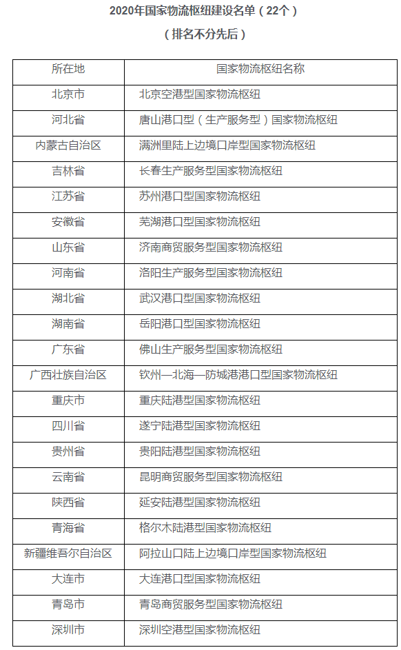 近日,国家发展改革委、交通运输部联合印发《关于做好2020年国家物流枢纽建设工作的通知》,共有22个物流枢纽入选2020年国家物流枢纽建设名单。