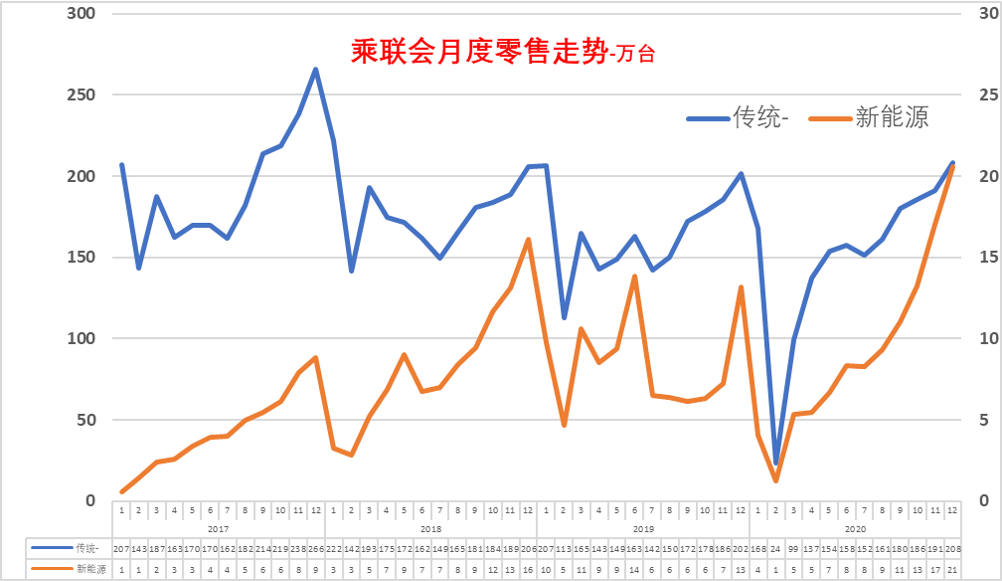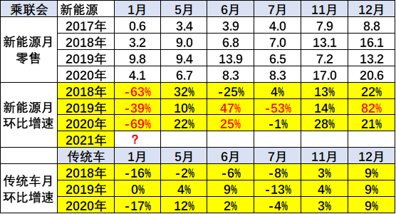 新能源车销量走势趋同于传统车。也就是月度间的环比波动减小。今年的1月销量估计与2020年12月的销量变化幅度就会减小较多。