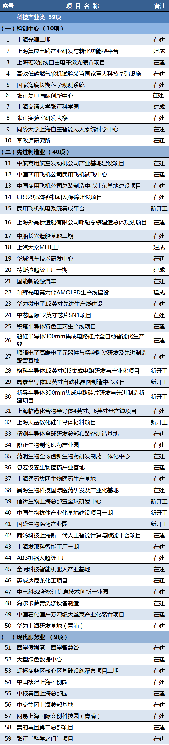 计划新开工8项:民用飞机航电系统集成平台、格科半导体12英寸CIS集成电路研发与产业化项目、鼎泰半导体12英寸自动化晶圆制造中心项目、新昇半导体300mm集成电路硅片研发与先进制造新建项目、上海天岳碳化硅半导体材料项目、信达生物上海总部暨全球研发中心、中国生物抗体产业化基地建设项目一期、国盛生物医药产业园。