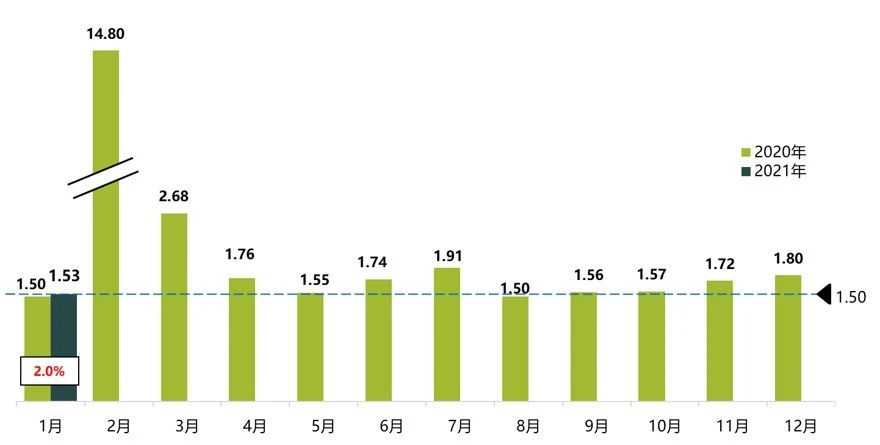 2021年2月10日,中国汽车流通协会发布2021年1月份“汽车经销商库存”调查结果:1月份汽车经销商综合库存系数为1.53,同比上升2%,环比大幅下降15%,库存水平位于警戒线以上。