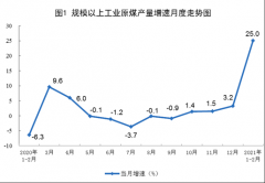 原煤生产同比较快增长,日均环比略有下降。1—2月份,生产原煤6.2亿吨,同比增长25.0%,比2019年1—2月份增长17.1%,两年平均增长8.2%;日均产量1047万吨,比上年12月份减少88万吨。进口煤炭4113万吨,同比下降39.5%。