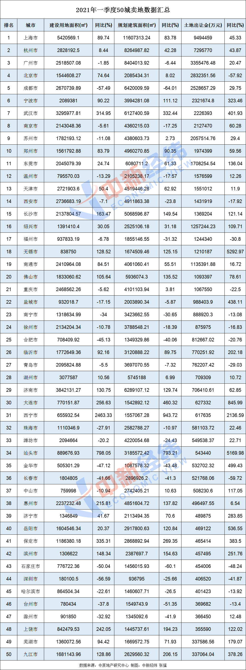 此外,数据显示,一季度,共有上海、杭州、广州、北京、成都、宁波、武汉、南京、苏州、郑州、东莞、温州、天津、西安、长沙、绍兴、福州、无锡、南通、佛山、重庆等21城卖地收入超百亿。