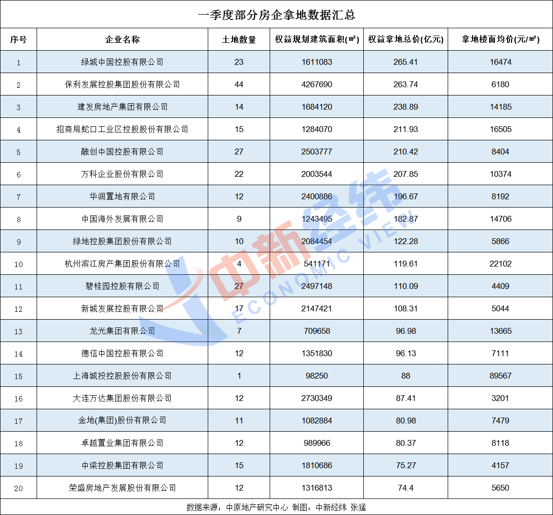 房企拿地方面,中原地产研究中心统计数据显示,一季度,有12家房企拿地超百亿。