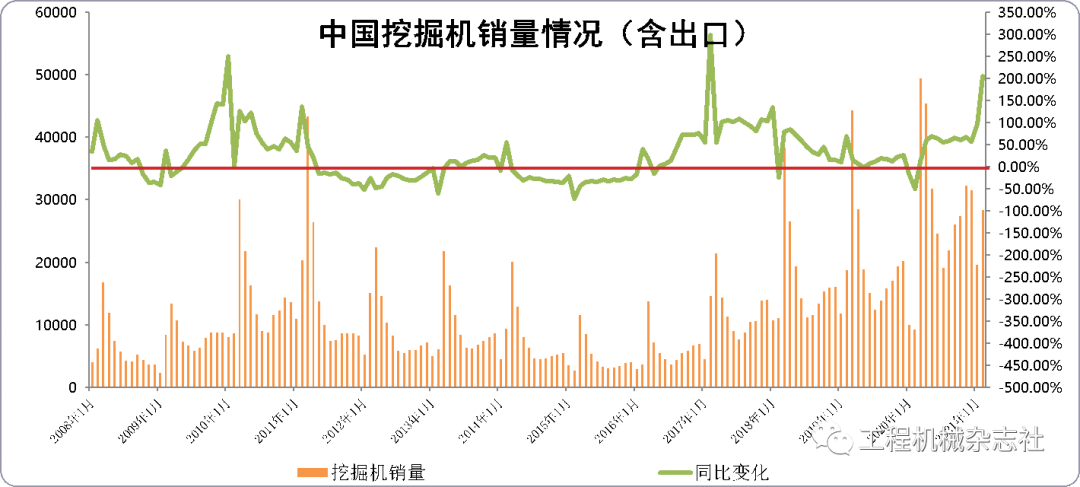 2016年下半年开始,在房地产和基础设施建设投资回暖、主机换新周期和产品库存周期等多因素叠加影响,中国挖掘机械迎来了久违的“暖阳”和“温暖”,2016年同比增长19%,这种高景气度一直持续至今。